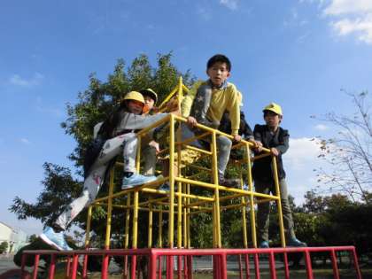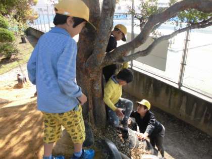 青い空、高い空。とても気持ちのよい秋の日です。みんなでなかよく外遊びをしました。遊ぶ順番やルールを自分たちで話し合って決めました。