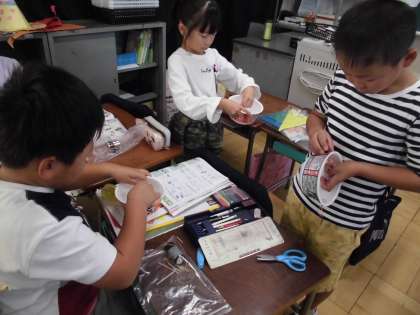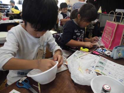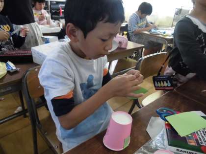 おもちゃ作りでは、まず自分で考え作り、次に友達に相談して試行錯誤しています。みんな楽しそうに活動していました。
