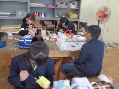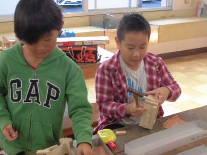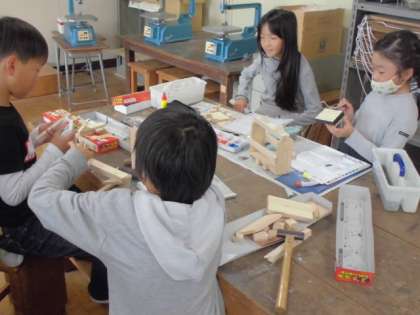 図工の授業では木を使って釘をうったり、のこぎりを使って切ったりして作品を作っています。最後には色ぬりをしています。自分が考えた通りの作品を作ることはなかなか難しいですが、自分達で考えて作っています。次回の図工の授業が楽しみです。