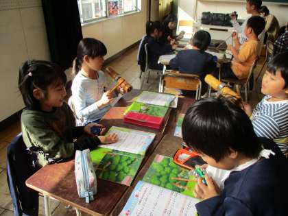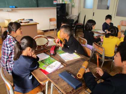 音楽では、合奏の練習をしています。楽器の難しさに触れながらも、楽しむ姿が見られました。