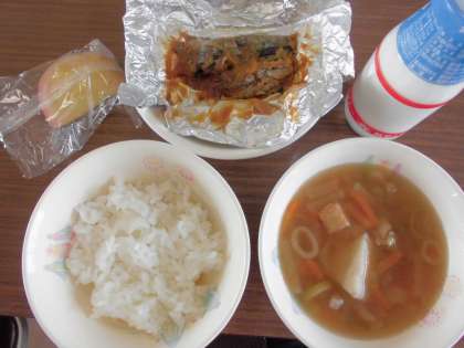 ごはん、牛乳、吉野汁、さんまの銀紙焼き、りんご