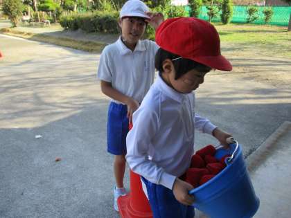 いいお天気です。運動場で走ったり、Tボールをしたり、玉入れをしたり。しっかり体を動かしました。後片付けもしっかりできました。