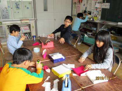 カタカナのつく言葉を考え、みんなでいっぱい発表をしました。3時間目は、おもちゃ祭りに出す「火の玉ロケット」をみんなで協力してたくさん作りました。音楽はレコード鑑賞をしたり、ピアノをみんなで少しずつ触ったりして楽しく学習しました。