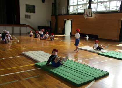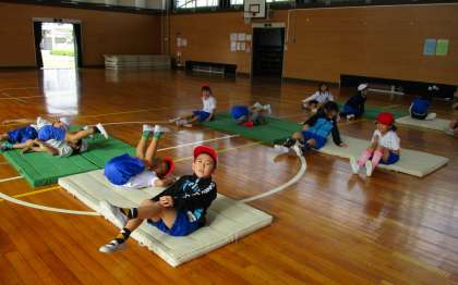 色々な方向へ転がりました。「手を開いて着くといいよ」「おへそを見て転がるよ」など、気をつけるとよいことを意識して、練習できました。