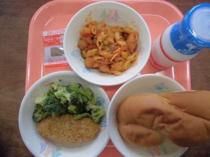 クロスロールパン、牛乳、ペンネのナポリタン、コーンフライ、ブロッコリーのドレッシング和え、コーヒーパウダー