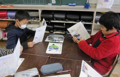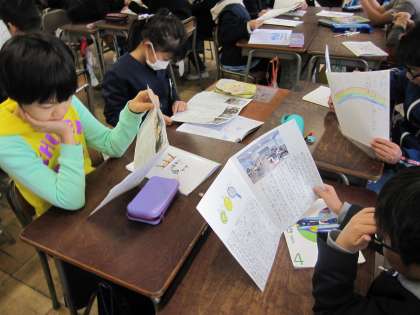 国語でクラブ活動を紹介するリーフレットを作る学習に取り組んでいます。写真を貼ったり、絵を描いたりして作品を仕上げました。今日は友達同士で読み合い、いいところを見付けました。