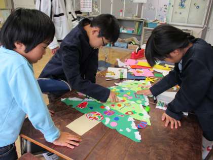もうすぐ12月。みんなが描いた絵をツリーに貼って飾りました。
