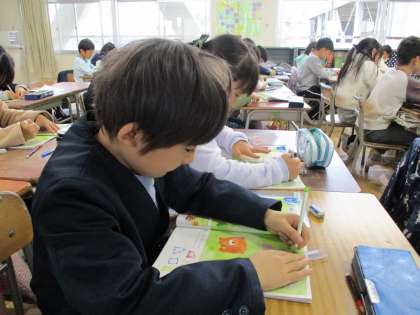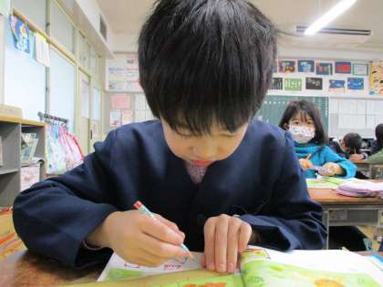 算数は新しい単元に入りました。今日は線と線を結んで形を完成させました。