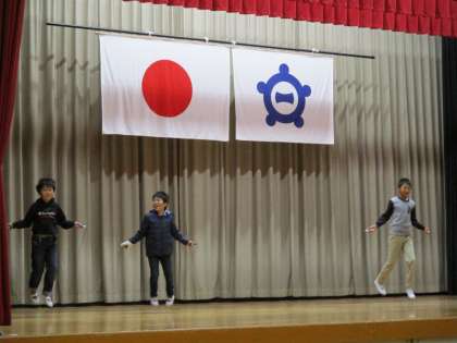 今朝は、児童集会が行われ、体育委員による、中間放課のなわとび練習の取り組みについて、実演発表を交えながら連絡がありました。
