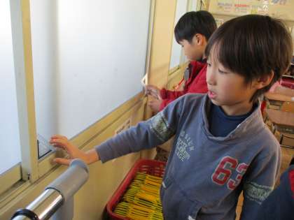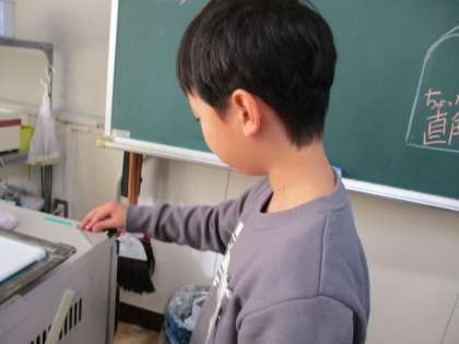 今日は「直角」という言葉を覚えました。覚えた後、三角定規の直角を使って、教室の中の直角探しをしました。思っていたよりも多くあり、身の回りの角について視野を広げることができました。