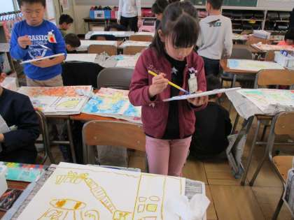 今日は読書感想画の色塗りをしました。ティッシュを使って、ポンポン塗りをしました。完成が楽しみですね。