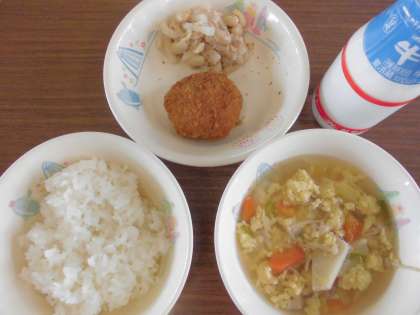 ごはん、牛乳、かきたま汁、なすのミンチカツ、だいこんとお豆のサラダ