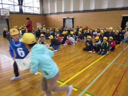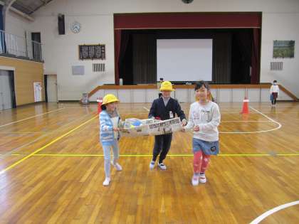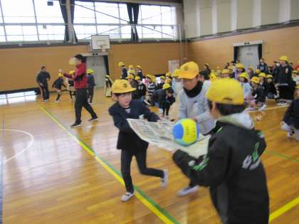 今日は待ちに待ったなかよし集会があり、ペア学年の2年生と新聞を使ってボールを運びレースをしました。