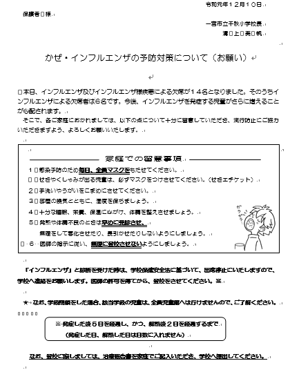 12月10日 かぜ・インフルエンザの予防対策について(お願い)