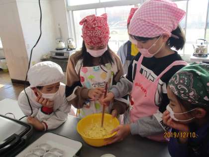 5年生全員で、収穫したサツマイモを使って、おやつ作りをしました。二人とも容器に材料を入れたり、使った容器をきちんと洗ったりして協力しました。出来上がったホッカホカのお芋のケーキに、みんな「美味しいね!」と笑顔が溢れていました。
