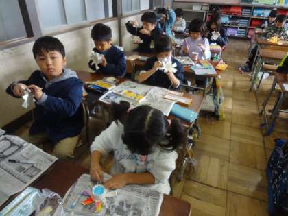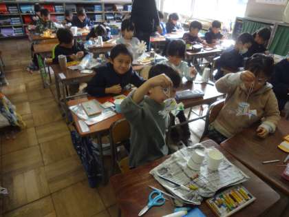 12月10日 回ったよ 1年生 公開日 2019/12/10 更新日 2019/12/10 1年 図工で、「クルクルまわして」をしました。 丁寧に切り込みを入れて、折っていくこと30分。 いざ糸をつけて、回してみたら、見事にクルクル回りました。 早くできた子は、外で走ってたくさん回転させました。 「すごい!」「きれいな模様だね」 たくさんの歓声が上がりました。