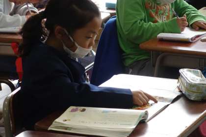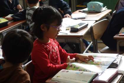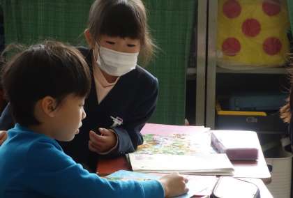 昔話の主人公を、みんなで話し合いながら見つけていました。