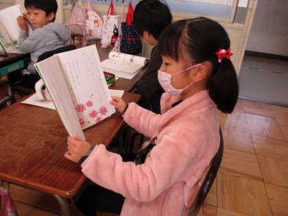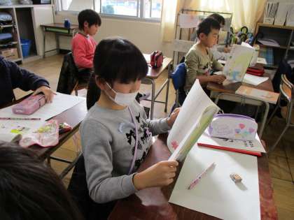 国語の授業では、ワークシートが終わった児童は、教科書の黙読をしています。
