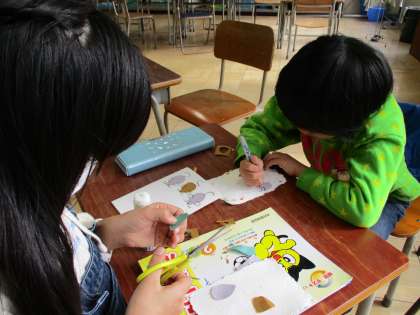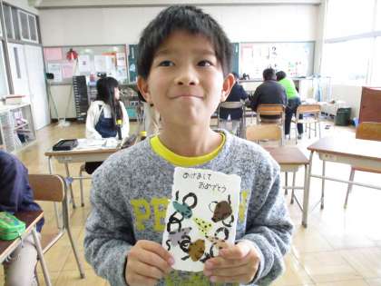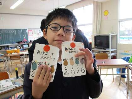 交流の先生に出す年賀状を作りました。ねずみさんを貼ったり、筆で字を書いたりしてすてきな年賀状ができました。