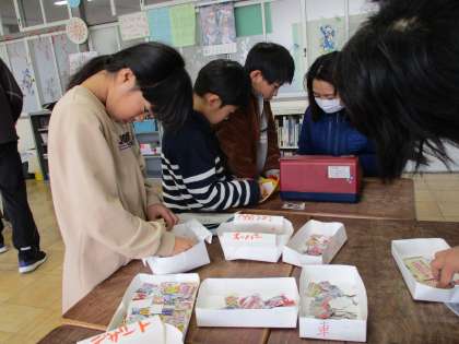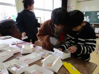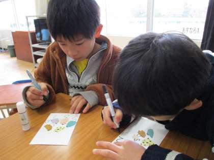 本物の年賀はがきに宛名を書いたり、ねずみの貼り絵をしたりしました。