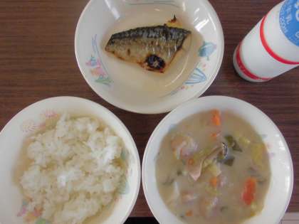 ごはん、牛乳、豆乳なべ、さばの塩焼き