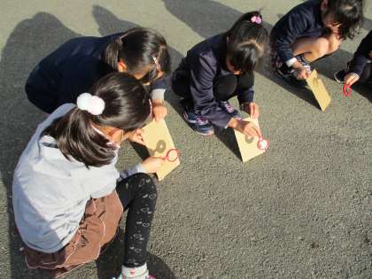 理科の学習では、虫めがねを使って、太陽の光を集めました。段ボールに当たる光の円を小さくすると、けむりが出てきました。紙と虫めがねの角度を調節すると、うまくできました。