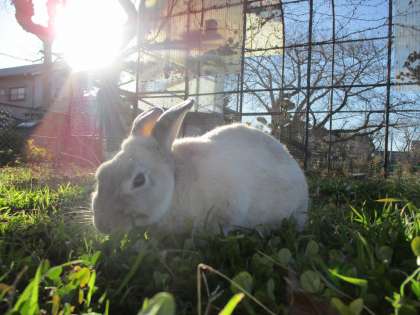 ウサギのモコも、元気に草原で遊んだり、葉を食べたりしています。