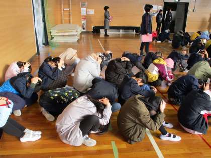 5年生も屋内運動場で、安全指導担当の先生からお話を聞いた後、緊急地震速報が鳴ったのと同時に子どもたちは頭の安全を守る姿勢を、素早くとることができました。