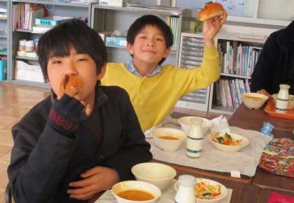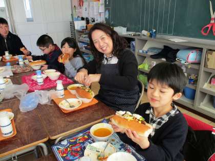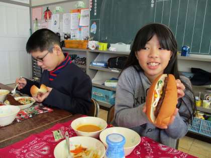 今日の給食はサンドイッチ。細長いハンバーグとサラダを細長いパンにはさんでサンドイッチを作りました。みんなおいしくできました。