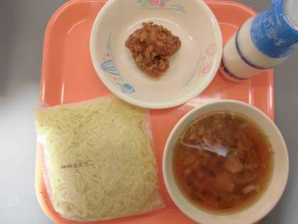 中華めん、牛乳、しょうゆラーメン、鶏肉のから揚げ