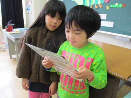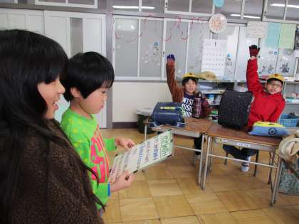 帰りの会の時間の司会を日直さんがしています。「今日がんばったことは何ですか?」と聞いたり、あいさつをしたり、しっかりがんばっています。