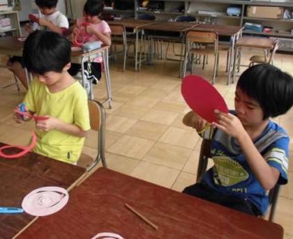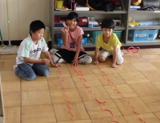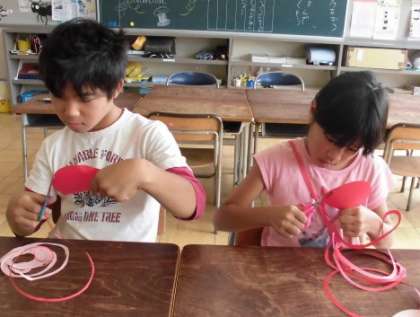 図工の時間に、はさみの練習をしました。左手を上手に動かしながら、長く長く紙を切っていきました。細〜く長〜く切れました。