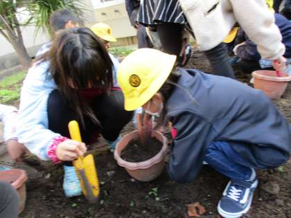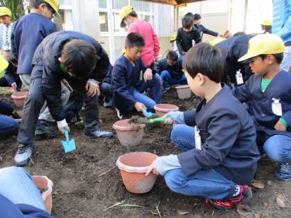 12月の様子です。ペア学年の5年生のお兄さん、お姉さんと一緒にパンジーの苗を植えましたね。
