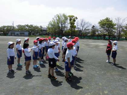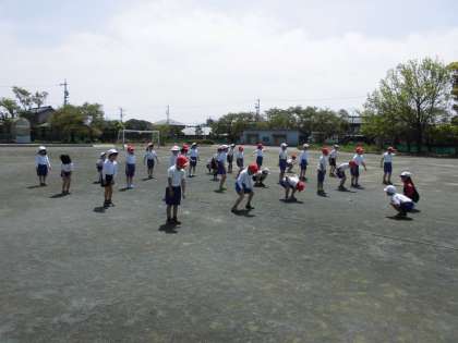 体育の準備体操の様子です。体育係のあとに続いて大きな声で体操をしています。けがをしないためにも大切ですね。