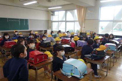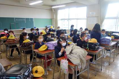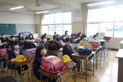 4月7日 登校後の様子 仮の担任が、千秋っ子を迎えましたが、どの学級も静かにお話を聞いていました。