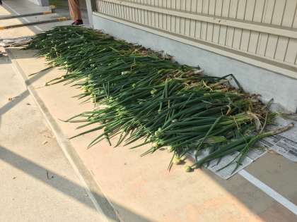 お子さんが3年生のとき、地域の方にお世話いただき、ネギを育ててきました。しかし、休校になったため、収穫やネギ焼きパーティーができないままになっていました。そこで、本日職員でネギを収穫し、中央渡りに並べました。ご希望の方は、今週中、ご都合のよろしいときに学校までお越しください。職員は立ち会いませんので、必要な分だけお持ち帰りください。