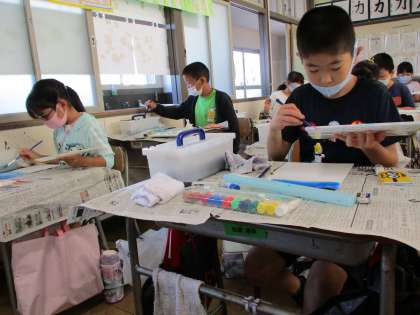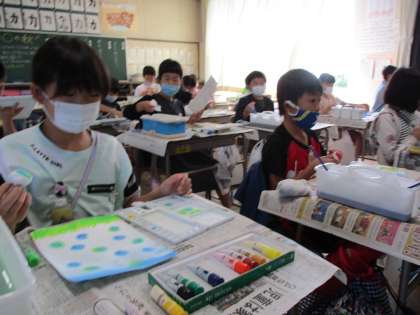 絵の具の使い方の学習をしました。濃さを変えたり、タンポを使ったり、いろいろな技が身に付きました。