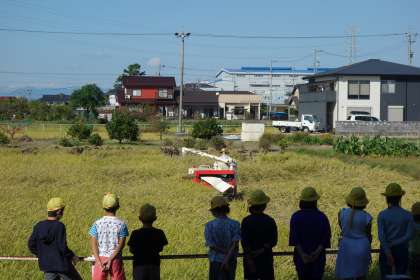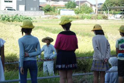 5年生が、社会科の学習の一環として、稲刈りの見学を行いました。
