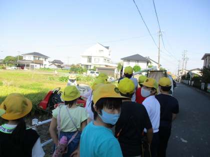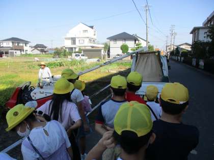 本日は稲刈りの見学を行いました。今年は稲刈りの体験は行えませんでしたが、学習した機械を実際に見て、稲刈りの大変さを知ることができました。