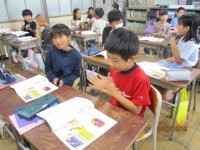遮光板を使って太陽を見ました。丸い太陽を見ることができて、皆喜んでいました。方位磁針を使って、どの方向に太陽があるのかも調べました。
