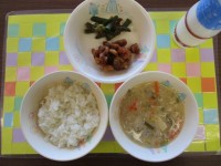 今日の給食は、ごはん、牛乳、チンゲンサイと豆腐の中華スープ、チンジャオロース、ココアパウダーでした。チンゲンサイは、1970年代に中国から入ってきた野菜です。同じ時期にさまざまな野菜が日本に入ってきましたが、その中でもチンゲンサイは、味や食感が日本人の好みに合い、定着しました。今では日本各地で栽培されています。