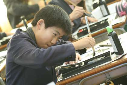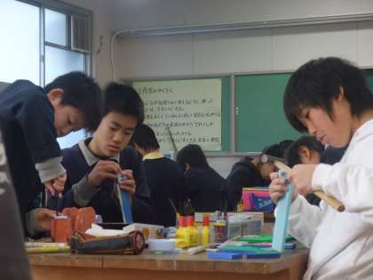 写真は本日の授業の様子です。上から1組の理科の調べ学習の様子、中は2組の書写の今年の一文字を書いている様子、3組は図工のテープッカッター作成の様子です。