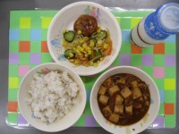 今日の給食は、ごはん、牛乳、ポークカレー、いちごゼリー和えでした。