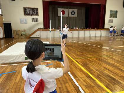走り高跳びの練習をしています。正しいフォームでとべるように、Chromebookを使って撮影し、確認しながら進めています。
