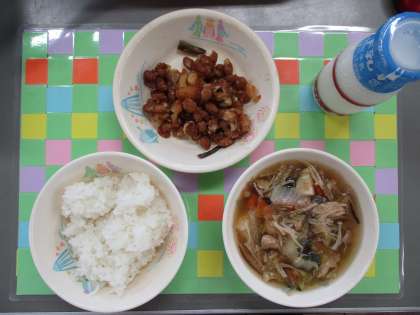 今日の給食は、ごはん、牛乳、ほきと大豆の甘がらめ、ちゃんこ汁でした。