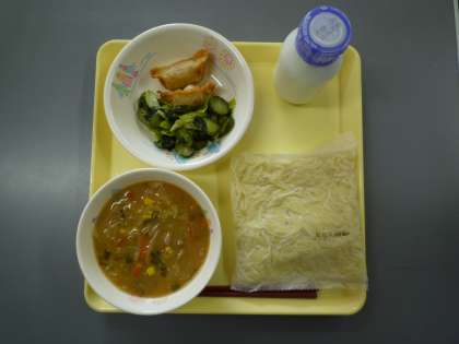 本日の献立は,中華麺,牛乳,味噌ラーメン,揚げ餃子2個,きゅうりのナムルです。