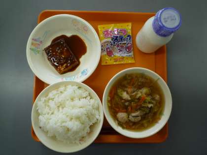 本日の献立は,ご飯,牛乳,鶏団子汁,豆腐ステーキねぎ味噌和え,いもけんぴです。