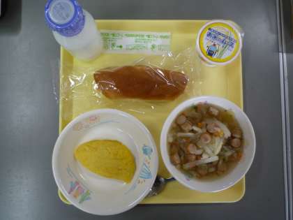 本日の献立は,米粉パン,牛乳,コンソメスープ,ミートビーンズオムレツ,お米のムースです。