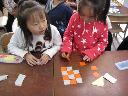 算数:正方形、長方形、三角形を敷き詰めて図形の感覚を身につけました。
