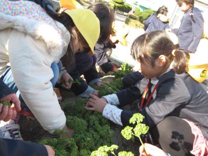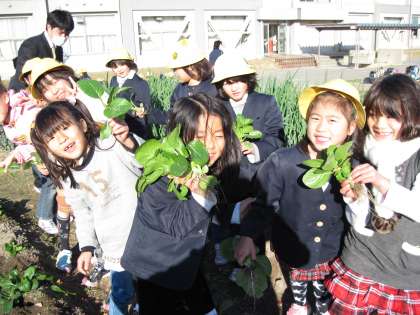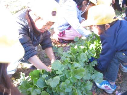 畑で育てていた小松菜、大根、パセリ、ホウレンソウの収穫をしました。